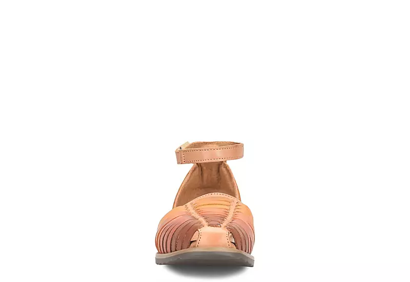 Take comfort in a simpler style with the Rylina women’s flat from Eurosoft. Featuring a leather upper with a design that evokes the colors of a sunset, this hook & look strap huarache goes easily from spring to summer. The padded insole cushions your steps while the outsole offers durability.